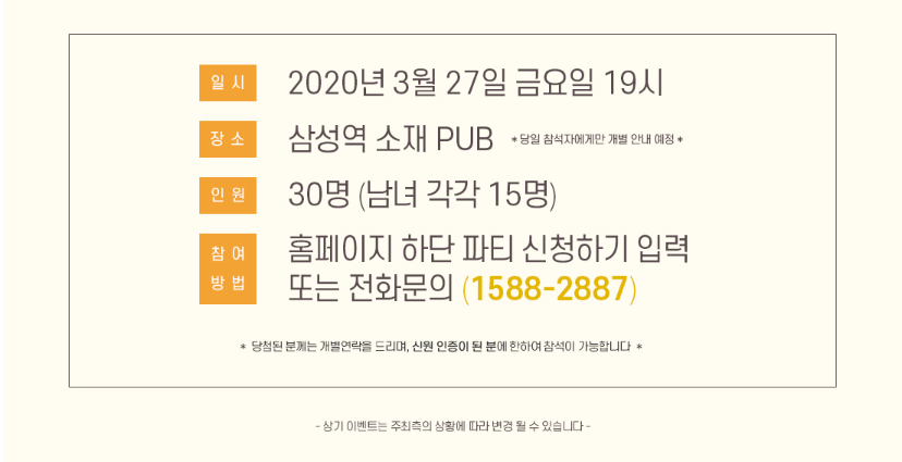 오는 3월 27일 (금) 19시에 삼성역 소재의 PUB에서 진행되며 싱글 남녀 각각 15명을 초대하여 열릴 예정입니다. 당첨된 분께는 개별 연락을 드리며, 신원인증이 된 분에 한하여 참석이 가능합니다!