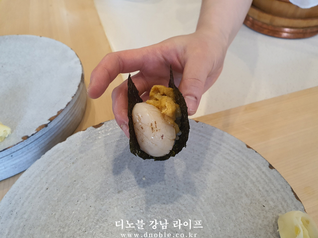 청담 맞선 장소인 스시카나에의 시그니처인 가리비관자의 통통한 식감과 더불어 부드러운 우니의 조화는 풍미 좋은 재료들이 더해진 만큼 서로 잘 어우러지게 퍼지는 고소함이 환상적인 맛입니다.