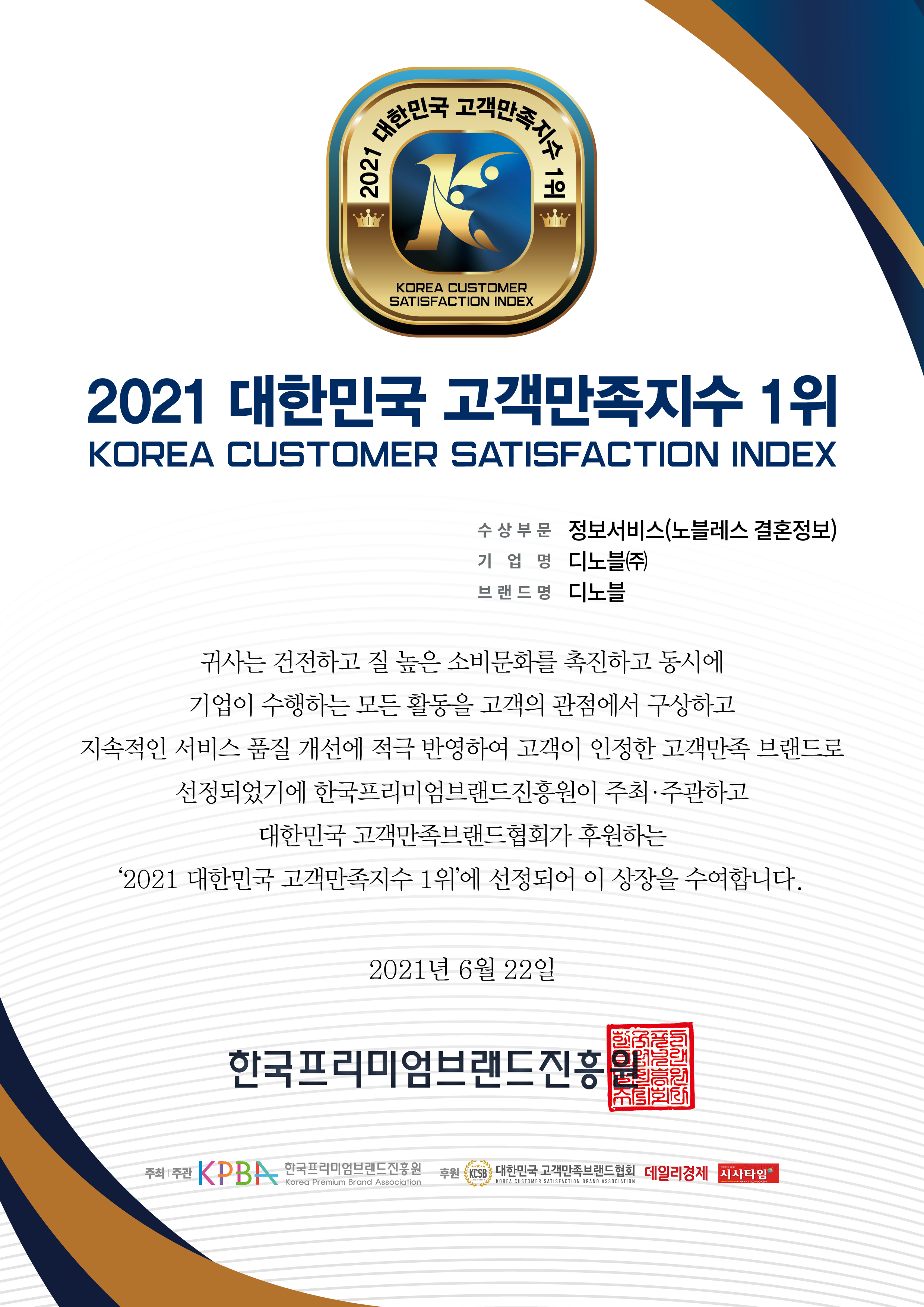 안녕하세요. 디노블 결혼정보회사 강남 라이프입니다. 디노블이 지난 6월 22일 한국 프리미엄 브랜드 진흥원이 주최하며 고객 만족 브랜드 협회가 주관하는 2021 대한민국 고객만족지수 1위를 수상하게 되었습니다.