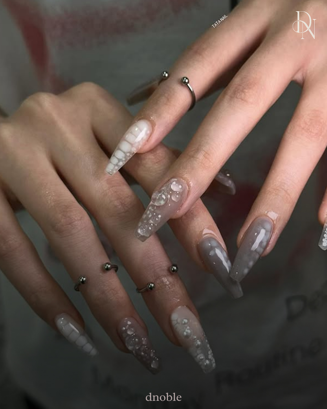 그레이 톤과 투명감이 어우러진 네일로,