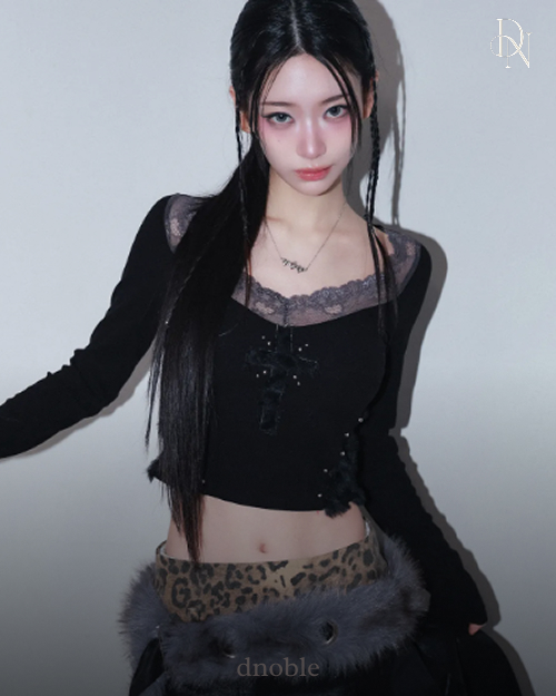 네크라인을 따라 흐르는 섬세한 레이스와 가슴 중앙의 크로스 패치,